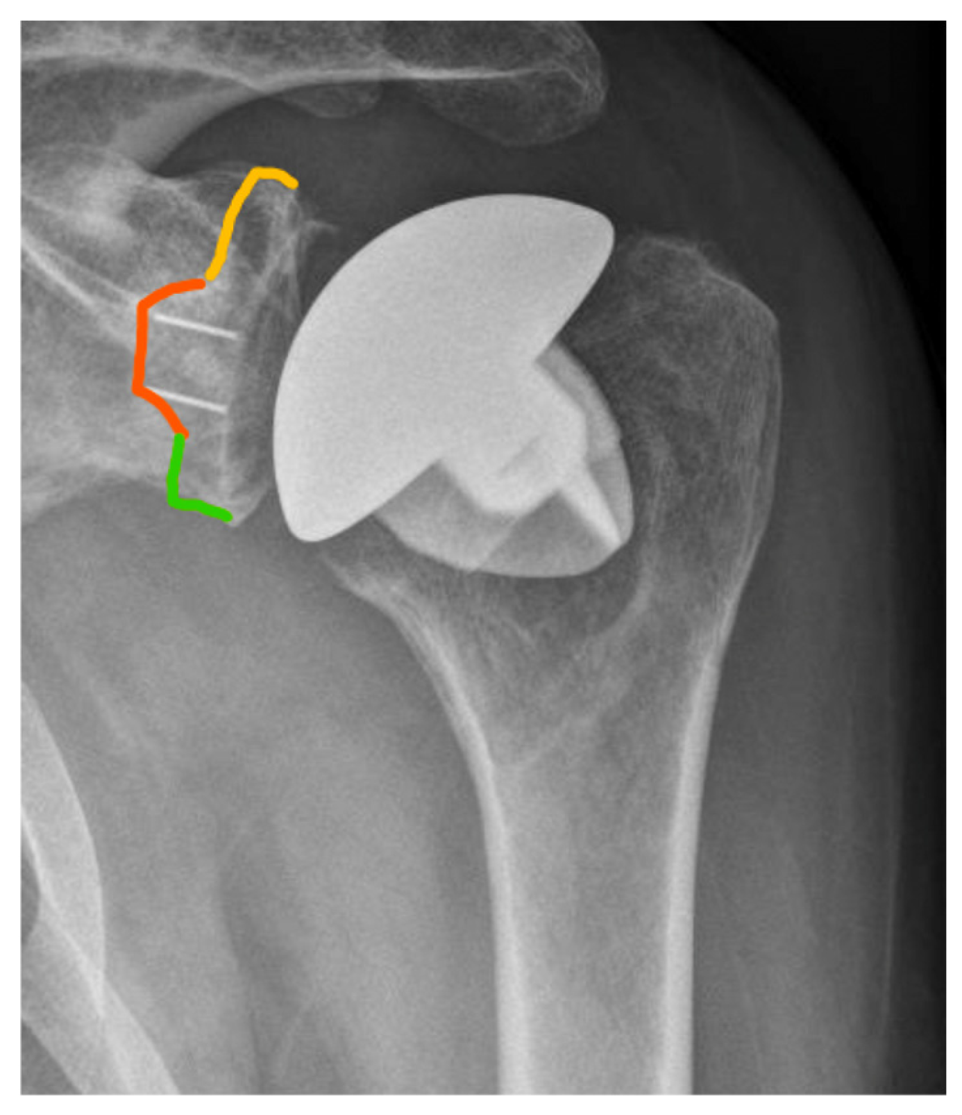 - Gohlke, F.; Werner, B.; Wiese, I. Glenoidrekonstruktion bei Wechseloperationen an der Schulter [Glenoid reconstruction in revision shoulder arthroplasty]. Oper. Orthop. Traumatol. 2019, 31, 98–114. (In German) [Google Scholar] [CrossRef] [PubMed]