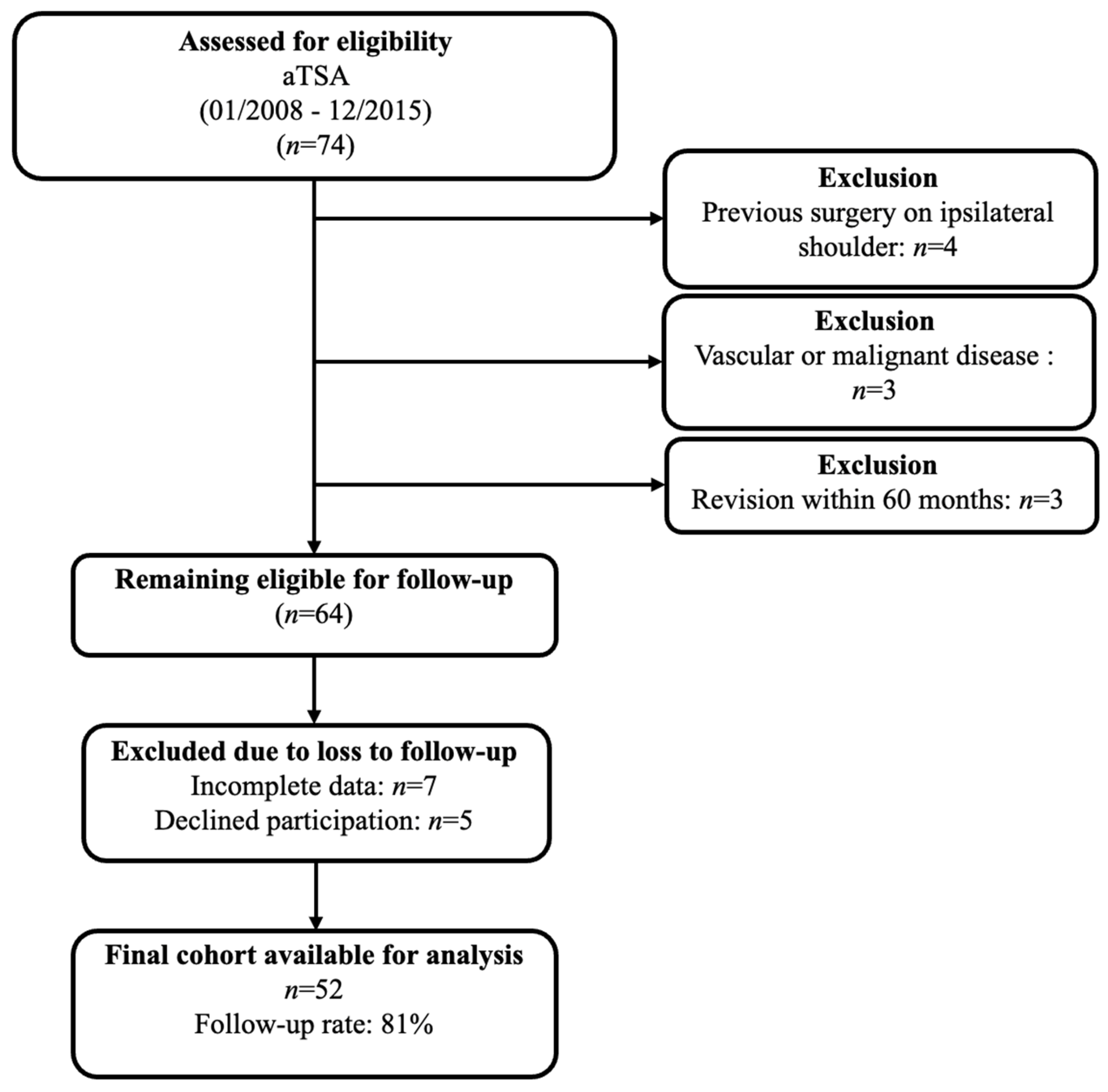 - Hochberger, F.; Weth, B.; Heinz, T.; Boehm, D.; Rudert, M.; List, K. Outcomes of anatomic total shoulder arthroplasty: Evaluation of implant-related, radiographic, and demographic factors influencing durability and revision rates. Int. Orthop. 2025, 49, 1133–1141. [Google Scholar] [CrossRef] [PubMed]