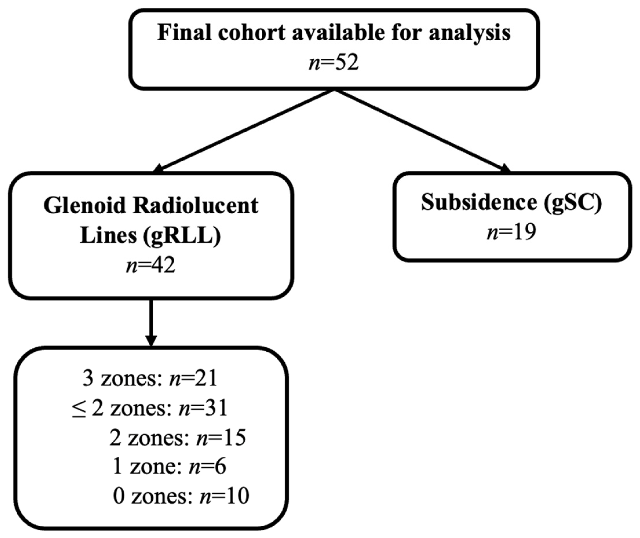 APA StyleHochberger, F., Limmer, J., Muhmann, J., Gohlke, F., Streck, L. E., Rudert, M., & List, K. (2025). Glenoid Radiolucent Lines and Subsidence Show Limited Impact on Clinical and Functional Long-Term Outcomes After Anatomic Total Shoulder Arthroplasty: A Retrospective Analysis of Cemented Polyethylene Glenoid Components. Journal of Clinical Medicine, 14(19), 7058. https://doi.org/10.3390/jcm14197058