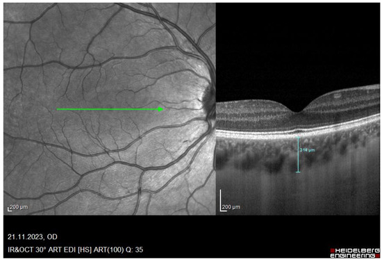 Red-free image of the retina and its corresponding OCT image of a participant with a manual segmentation line drawn through the SFCHR. A SFCHR of 314 um was measured in this particular subject. Image captured with the Spectralis OCT.