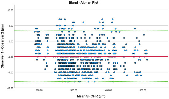 Bland–Altman Plot: The green lines represent 1.96 × standard deviations and the red line represents the mean difference between the two SFCHR measurements.