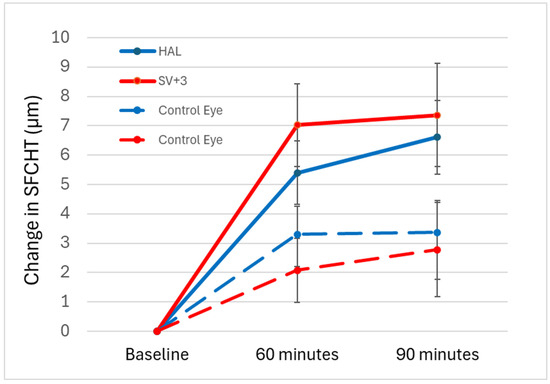 In the control eye, there was a slightly greater thickening when the fellow eye was exposed to HAL (3.38 ± 5.33 µm) compared to +3.00 D (2.78 ± 8.01 µm) after 90 min. However, similarly to the defocused eye, this difference was not statistically significant (p = 0.734). Pairwise comparisons with Bonferroni adjustment revealed no significant difference between baseline and 60 min or 90 min in the +3.00 D intervention (baseline vs. 60 min: p = 0.151, baseline vs. 90 min: p = 0.140). Conversely, a significant difference of 3.300 ± 4.845 was noted between baseline and 60 min in the HAL intervention (p = 0.08). However, the difference between baseline and 90 min was not statistically significant (p = 0.050). Additionally, no significant difference was observed between 60 and 90 min (p = 1.00 for both interventions). A significant mean difference of 3.176 µm (SE = 1.318 µm) was observed in the SFCHR with +3.00 D when comparing defocused eyes with control eyes over the entire measurement period (p = 0.020). However, the mean difference of 1.779 µm (SE = 0.960 µm) for HAL between defocused and control eyes did not reach statistical significance (p = 0.070).