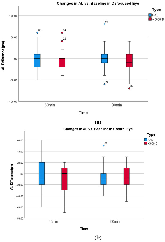 (a). Box-plot change in AL for defocused eyes. (b). Box-plot change in AL for the non-defocused control eyes.