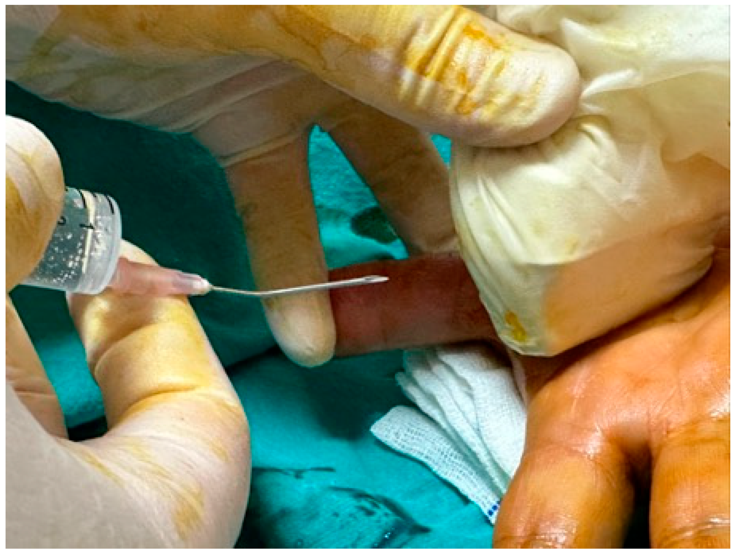 - Villanova, F.J.F.; Martinel, V.; Marès, O. Ultrasound-guided trigger thumb release. Hand Surg. Rehabil. 2025, 44, 102084. [Google Scholar] [CrossRef]
