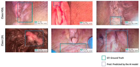 Examples of correct model predictions for vulvar HSIL (first row) and LSIL (second row) lesions. Blue boxes indicate predicted bounding box generated by the model. Green boxes represent ground truth annotated by consensus of expert physicians. The model’s confidence score for each prediction is also presented in parentheses, indicating the certainty of the classification. Images were selected to illustrate variability in lesion appearance, lighting conditions, different devices, and procedural stage (including non-stained, acetic-acid-stained, and post-biopsy frames).