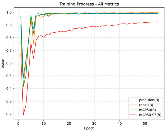 Training progress of the YOLOv11-based model across 55 epochs. The y-axis represents the normalized performance metrics (ranging from 0 to 1), and the x-axis represents the number of training epochs. In this context, an epoch refers to one complete iteration over the training dataset during model development. Precision (the same as positive predictive value) is the proportion of the predicted lesions that are actually correct. Recall (the same as sensitivity) is the proportion of true lesions that the model detected. mAP50 (mean average precision at 50% Intersection over Union, IoU) represents the percentage of predicted bounding boxes that overlap with the ground-truth annotation by at least 50%. mAP50–95 extends this metric by averaging performance across a stricter range of IoU thresholds (from 0.50 to 0.95).