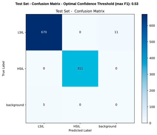 Frame-level confusion matrix comparing the model’s prediction with histopathological classification (considered the ground truth). Each value represents the number of frames in which a lesion was either correctly or incorrectly detected and classified. A frame is considered correctly classified if it contains a detected lesion matching the true label. During the test set, the model correctly predicted 670 LSIL cases and 311 HSIL cases, while 11 LSIL cases were misclassified as background, and 5 background areas were mistakenly labeled as LSIL. The scale on the right side of the table represents the color gradient corresponding to the frequency of predictions, with darker shades indicating higher values. This matrix reflects detection and classification performance rather than a conventional diagnostic accuracy/confusion matrix. As the YOLOv11 model detects and classifies lesions simultaneously, metrics like specificity and negative predictive value were not applicable due to the limited number of background frames.