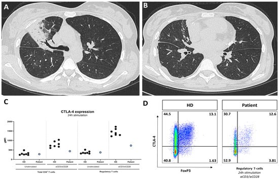 CT-scan showing lobar pneumonia (A) and focal bronchiectasis (B); (C) CTLA-4 expression on CD4+ T-cells and regulatory T-cells, unstimulated and after 24 h stimulation with aCD3/aCD28, in the patient and healthy donors (HDs), showing decreased CTLA-4 expression on CD4+ T-cells and regulatory T-cells during stimulated conditions in the patient compared with HDs; (D) decreased CTLA-4 expression FoxP3+ regulatory T-cells demonstrated through flow cytometry.