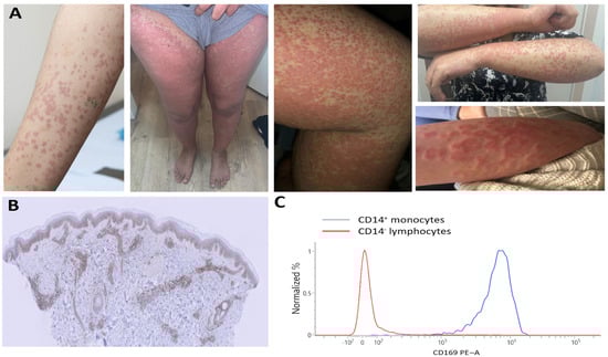(A) Inflammatory skin lesions showing vasculitis in hive-like rash. (B) Positive myxovirus resistance protein 1 (MxA) staining in dermatocytes using MxA immunostaining, with original magnification ×10. (C) Increased CD169 expression on CD14+ monocytes demonstrated through flow cytometry.