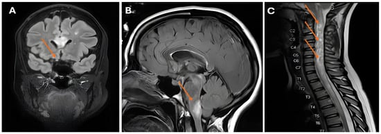 (A) Abnormal appearance and pathological enhancement of the right optic nerve (arrow); (B) white matter lesions in the brachium pontis (arrow); (C) longitudinally extensive spinal cord lesion with swelling and the appearance of bright spotty lesions (arrows).