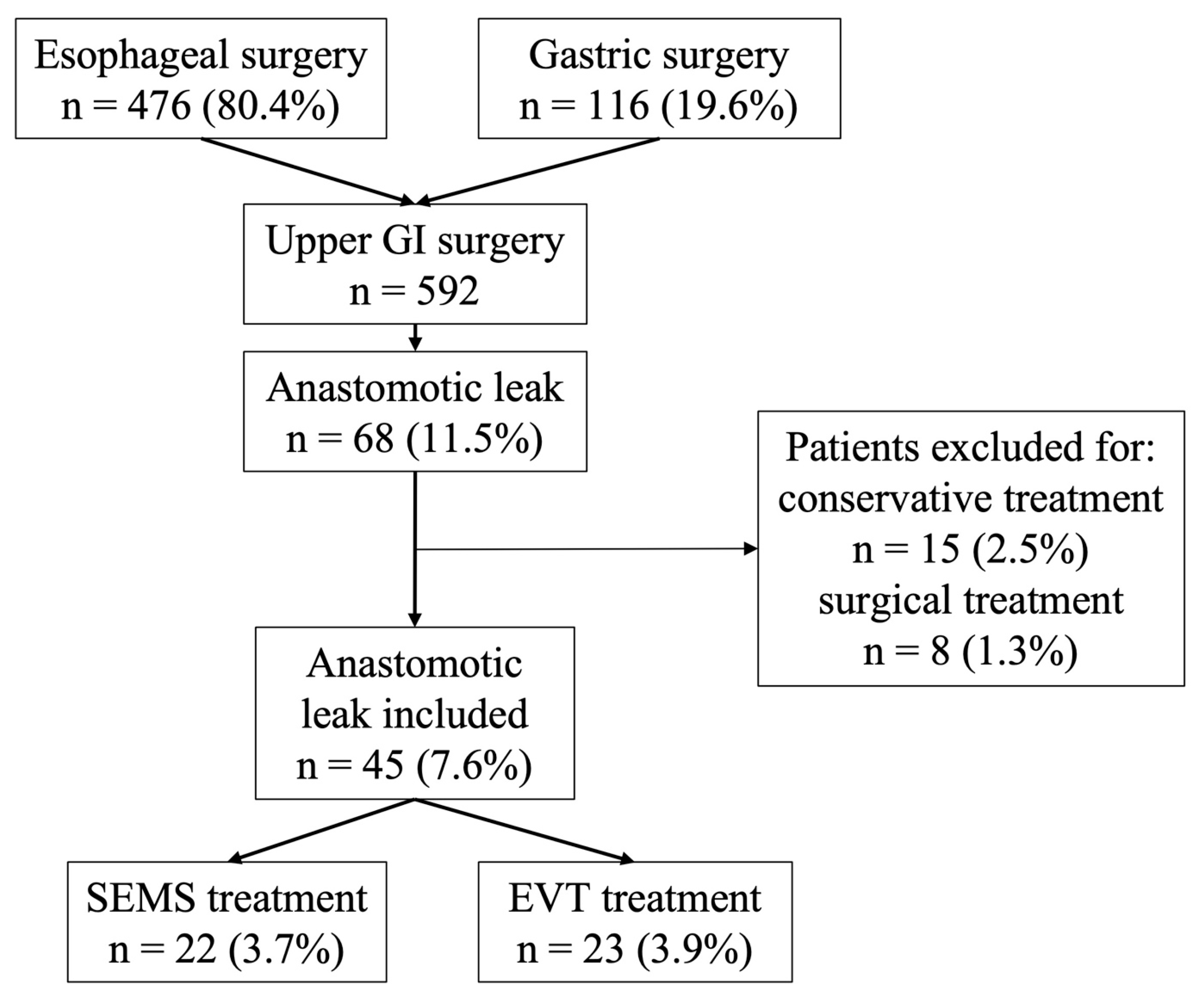 - Mandarino, F.V.; Barchi, A.; D’amico, F.; Fanti, L.; Azzolini, F.; Viale, E.; Esposito, D.; Rosati, R.; Fiorino, G.; Bemelman, W.A.; et al. Endoscopic Vacuum Therapy (EVT) versus Self-Expandable Metal Stent (SEMS) for Anastomotic Leaks after Upper Gastrointestinal Surgery: Systematic Review and Meta-Analysis. Life 2023, 13, 287. [Google Scholar] [CrossRef] [PubMed] [PubMed Central]