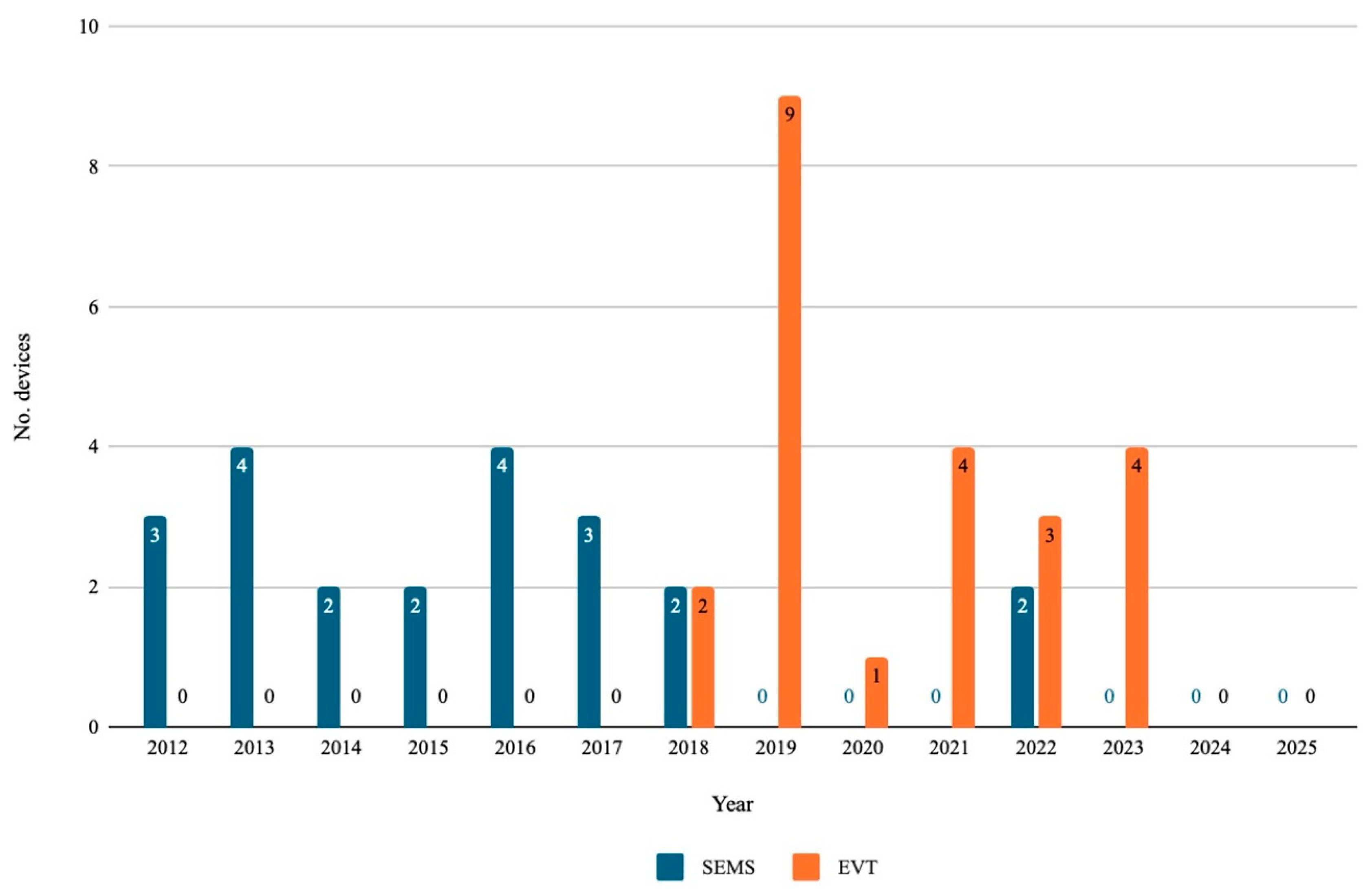- de Oliveira, A.T.; Barreira, M.A.; da Cunha Parente Júnior, J.W.; Ribeiro, J.B.e.S.; de Azevedo, O.G.R.; de Vasconcelos, P.R.C. Endoscopic self-expandable metal stent versus endoscopy vacuum therapy for traumatic esophageal perforations: A retrospective cohort study. Surg. Endosc. 2024, 38, 2142–2147. [Google Scholar] [CrossRef] [PubMed] [PubMed Central]