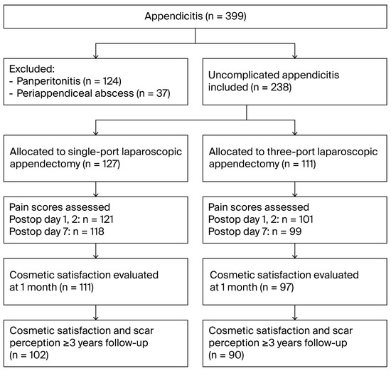 A total of 399 pediatric patients with suspected appendicitis were assessed for eligibility. After excluding 161 patients with complicated appendicitis, 238 patients with uncomplicated appendicitis were included: 127 underwent SLA, and 111 underwent TLA (Figure 1). Pain data were collected on postoperative days 1, 2, and 7. Cosmetic satisfaction (VASC) was assessed at 1 month and at 3 years or later. Scar perception was also evaluated at the ≥3-year follow-up using the six-item validated Scar Assessment Questionnaire (Patient and Parental Scar Assessment Scale, PSAS) (Table A1).