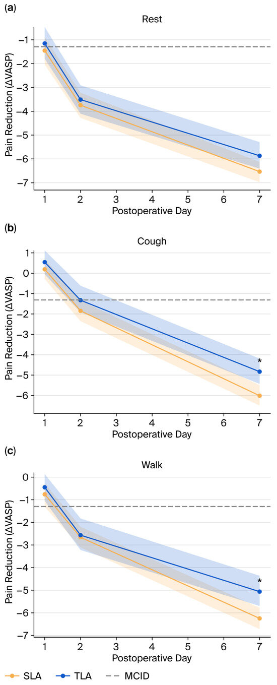 Postoperative pain reduction over time in SLA and TLA groups. Line plots represent changes in Visual Analog Scale scores for pain from baseline at rest (a), during coughing (b), and walking (c) on postoperative days (PODs) 1, 2, and 7 (deltaVASPn_pain, cough, or walk). ΔVASP was calculated as the difference from baseline. Shaded bands indicate 95% confidence intervals. The minimal clinically important difference (MCID) threshold of 1.3 is indicated by the dashed horizontal line. SLA (single-port laparoscopic appendectomy) is shown in orange; TLA (three-port laparoscopic appendectomy) is shown in blue. Asterisks (*) denote statistically significant between-group differences at POD7 (p < 0.01).