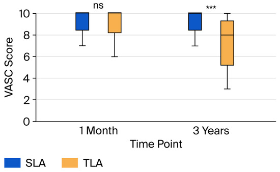 - VASC scores at 3 years remained significantly better for SLA patients (10 [9–10] vs. 8 [7–9], p < 0.001, Wilcoxon signed-rank test, r = 0.52, representing a large effect), confirming the robustness of the cosmetic benefit.