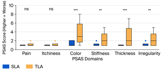 No significant differences were observed in the pain (1 [1–1] vs. 1 [1–1], p = 0.218, r = 0.08) or itchiness (1 [1–1] vs. 1 [1–1], p = 0.498, r = 0.04) domains, with both showing negligible effect sizes. The total PSAS score was significantly higher (worse) in the TLA group (7 [6–8] vs. 11 [8–17], p < 0.001, r = 0.45, medium-to-large effect).