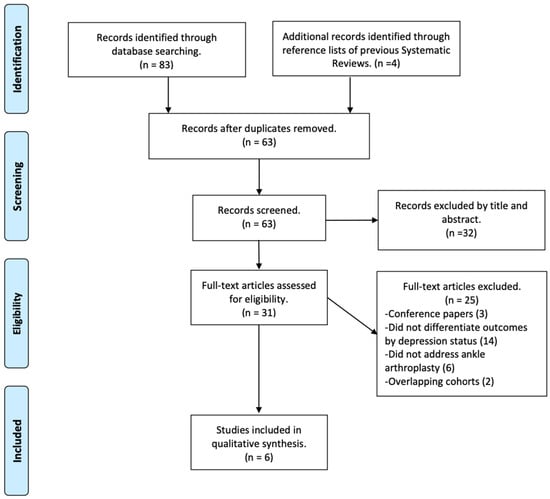 Eligible studies were defined according to the following criteria: (1) randomized controlled trials, prospective or retrospective cohort studies, or case series; (2) adult patients (≥18 years) undergoing primary total ankle arthroplasty for end-stage ankle arthritis; (3) depression assessed either through a documented clinical diagnosis (medical records or administrative coding) or validated screening tools; and (4) outcomes reported stratified by depression status in at least one relevant domain, including pain, function/disability, health-related quality of life, or complications such as readmission, discharge disposition, or length of stay. Studies were excluded if they (1) did not stratify results according to depression status; (2) evaluated ankle arthrodesis only; (3) were case reports, narrative or systematic reviews, or conference abstracts; (4) were non-peer-reviewed publications; (5) were not available in full text; (6) were not published in English; or (7) were animal or cadaveric studies.