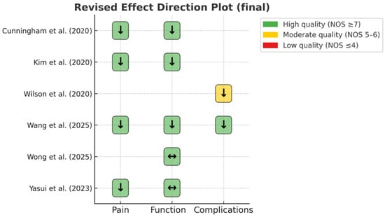 Given the heterogeneity of study designs, definitions of depression, and outcome measures, a quantitative meta-analysis was not methodologically appropriate. Instead, findings were synthesized narratively and summarized visually using a revised effect-direction plot [11]. This approach allows evidence to be aggregated when statistical pooling is not feasible, by displaying whether preoperative depression was associated with worse, better, or no difference in outcomes across studies. A single revised effect-direction plot was generated, incorporating three outcome domains—pain, functional outcomes, and complications—to provide a structured overview of the consistency of associations in the available literature. No statistical conversions were undertaken, and data were reported as presented in the original studies. Missing summary statistics were not imputed. Outcomes from individual studies were organized by domain and summarized in tables detailing study characteristics, and principal findings.