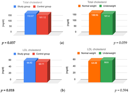 In our study, statistically significant differences were observed between the study and control groups in the mean values of total cholesterol, LDL cholesterol, fasting glucose, fasting insulin, HOMA-IR, prolactin, and morning cortisol. Table 3 presents the mean values of lipid parameters, fasting glucose, and insulin, HOMA-IR, prolactin, TSH, and morning cortisol for the study and control groups. Table 4 provides a detailed breakdown by corresponding subgroups. Figures S1 and S2 in the Supplementary Materials include corresponding bar charts of the subgroup data.