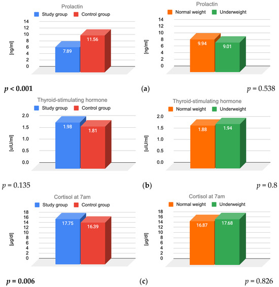 The reduced prolactin levels observed across the entire study group may reflect a consequence of chronic adaptation within the hypothalamic–pituitary–adrenal (HPA) axis. Reduced body weight is a chronic stressor for the body and particularly in the context of long-term stress, may lead to prolonged activation of the HPA axis, resulting in adaptive changes within the dopaminergic system—an increase in the activity of the dopaminergic system [40,41].