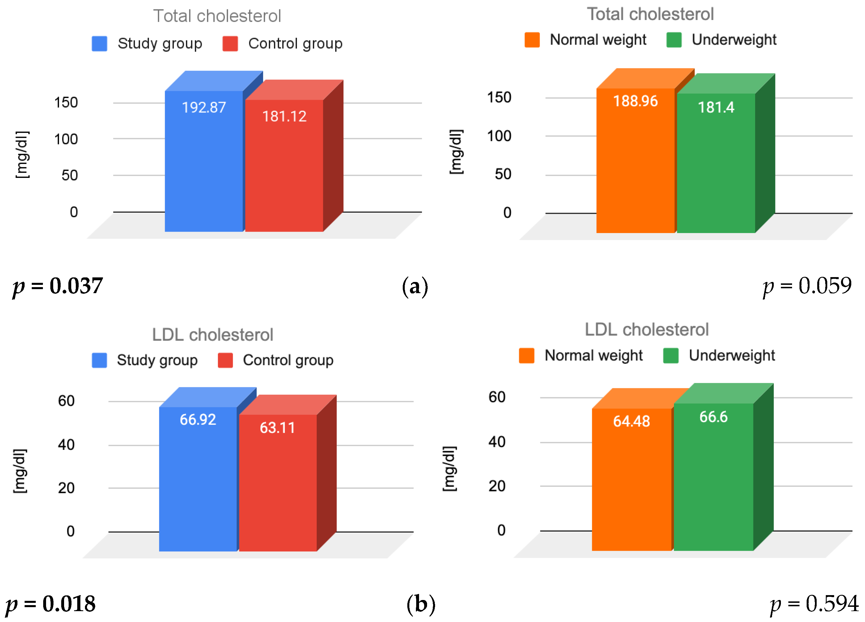 LDL cholesterol [mg/dL] (<130) | 67 ± 34.89 | 63 ± 24.78 | 0.018 |