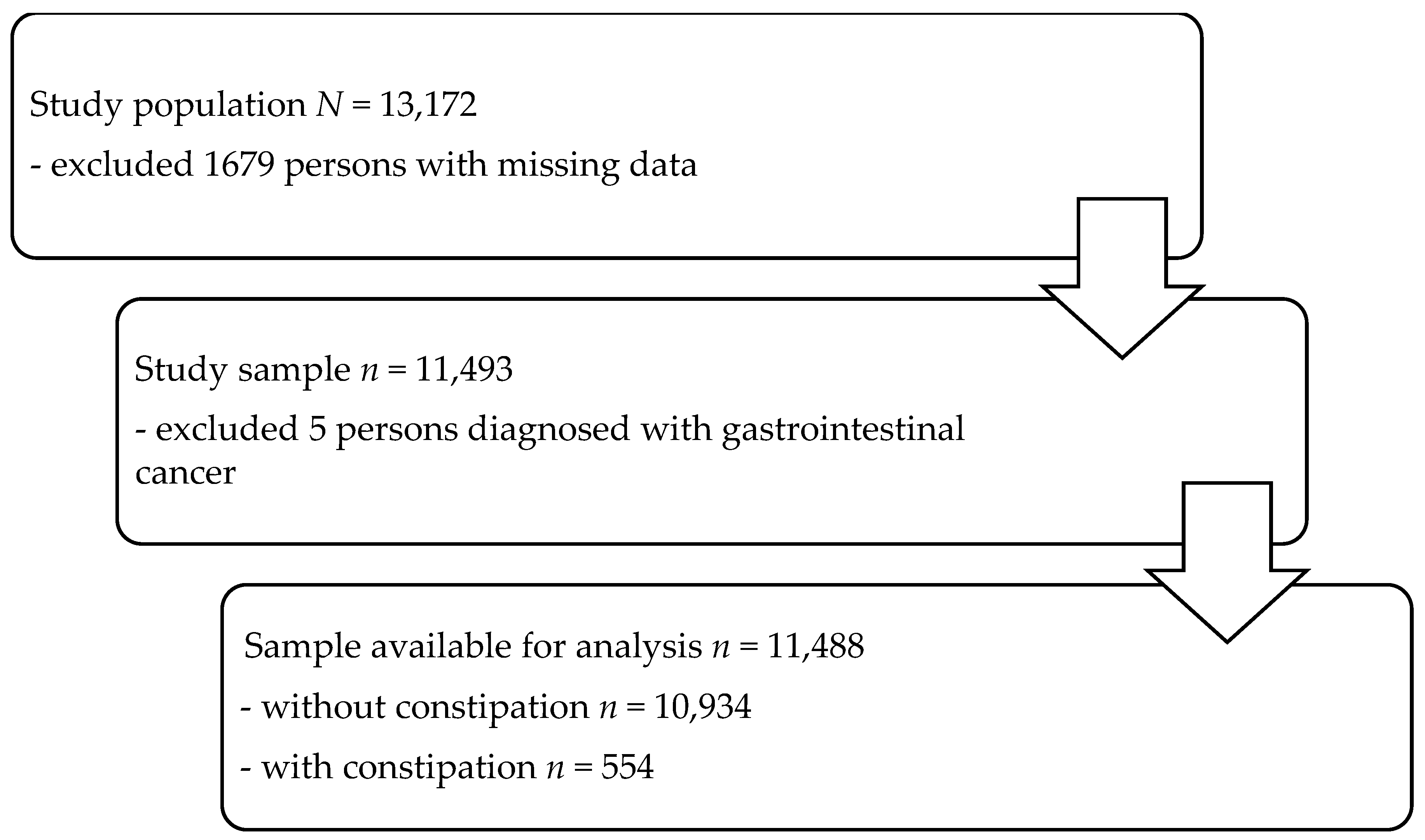 - Werth, B.L.; Christopher, S.A. Potential risk factors for constipation in the community. World. J. Gastroenterol. 2021, 27, 2795–2817. [Google Scholar] [CrossRef]