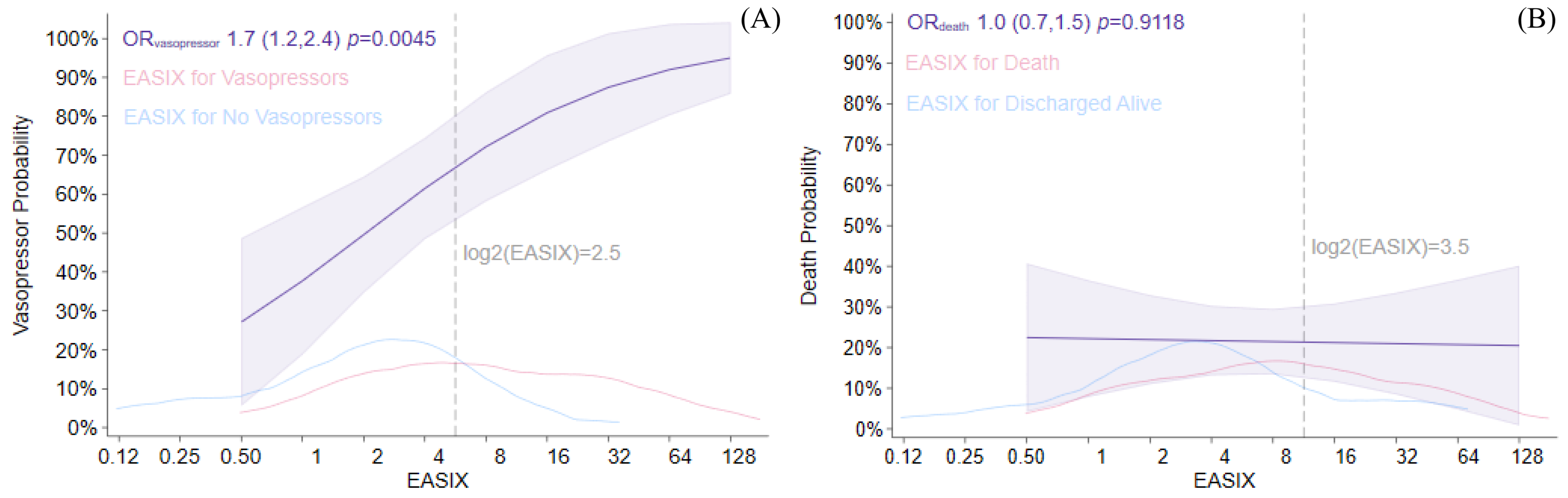 Figure 2. Endothelial Activation and Stress Index (EASIX) score associations with vasopressor use (panel (A)) and death probabilities (panel (B)). Vasopressor use and death probabilities are shown across the log2-EASIX distribution, with corresponding odds ratio estimates given with 95% confidence limits (purple). Individual kernel densities are provided for death and vasopressors (red) as well as vasopressor-free stays and surviving discharges (blue). Reference lines for each cut point are provided (gray, dashed). Logistic regression models adjusted for age, sex, and pre-sepsis HCT. (A) Vasopressor use model interpretation: each doubling of EASIX was associated with an OR of vasopressor use of 1.7, p = 0.004. (B) Death model interpretation: our data suggested EASIX was not associated with mortality (OR = 1.0, p = 0.912).