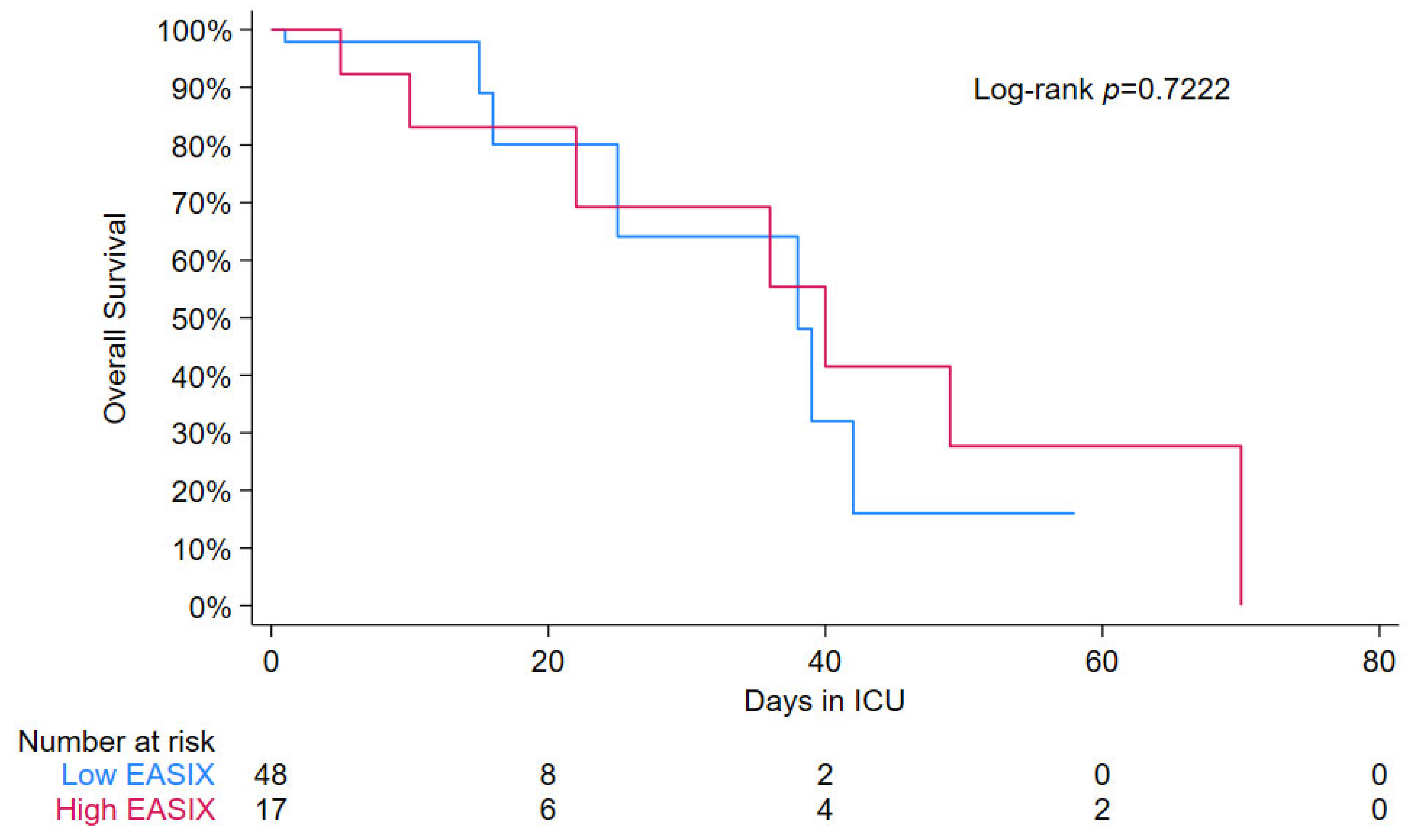 Figure 3. Kaplan–Meier curve for low vs. high EASIX (cut-point > 3.5). Kaplan–Meier curves comparing survival times between the low EASIX group (blue) and high EASIX group (red). The analysis shows a similar pattern between the groups, with a p-value of 0.7222 indicating the absence of statistical support above or below the cut point.