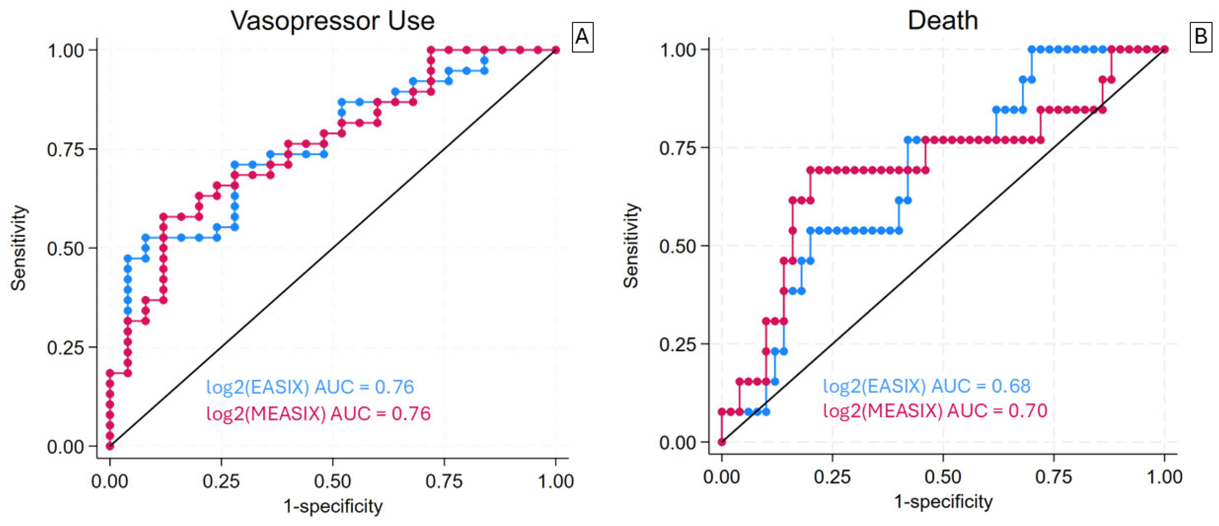 Figure 4. ROC curves for vasopressor use (panel (A)) and in-ICU mortality (panel (B)) of Endothelial Activation and Stress Index (EASIX) Score and a modified version that replaces measured serum creatinine with C-reactive protein. The receiver operating characteristic curve for all cut points of EASIX (blue) and MEASIX (red) for death and vasopressor use. The black diagonal line represents the cut point where, when above, the classifier makes predictions better than random guessing. (A) EASIX and MEASIX yielded a consistent area under the ROC curve (AUC) of 0.76 for vasopressor use. (B) EASIX and MEASIX yielded a similar AUC of 0.68 and 0.70, respectively, for in-ICU mortality.