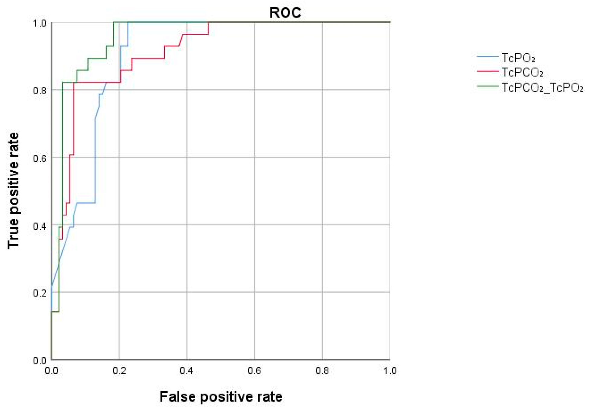 The ROC curves were plotted for TcPO2, TcPCO2, and the combined analysis of TcPO2 + TcPCO2 for predicting insufficient flap, and the areas under the curve (AUC) were calculated and compared. The results showed that the AUC values for TcPCO2, TcPO2, and TcPO2 + TcPCO2 in predicting insufficient flap were 0.912, 0.905, and 0.955, respectively. The predictive value of TcPCO2 was found to be greater than that of TcPO2, and their combined predictive value surpassed that of either TcPO2 or TcPCO2 used alone (Figure 3).