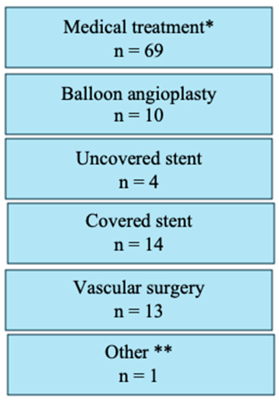 - Czerwińska-Jelonkiewicz, K.; Michałowska, I.; Witkowski, A.; Dąbrowski, M.; Chmielak, Z.; Jastrzębski, J.; Demkow, M.; Wasąg, P.; Kleczyński, P.; Sorysz, D.; et al. Vascular complications after transcatheter aortic valve implantation (TAVI): Risk and long-term results. J. Thromb. Thrombolysis 2014, 37, 490–498. [Google Scholar] [CrossRef]