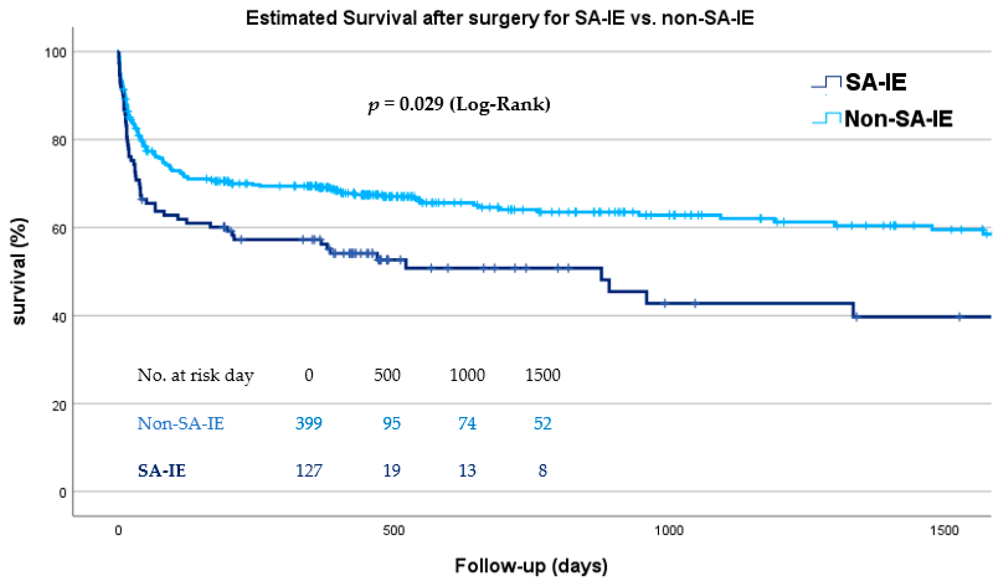 - Both short-term (30-day) and long-term survival were significantly poorer in patients with SA-IE compared to other IE patients.