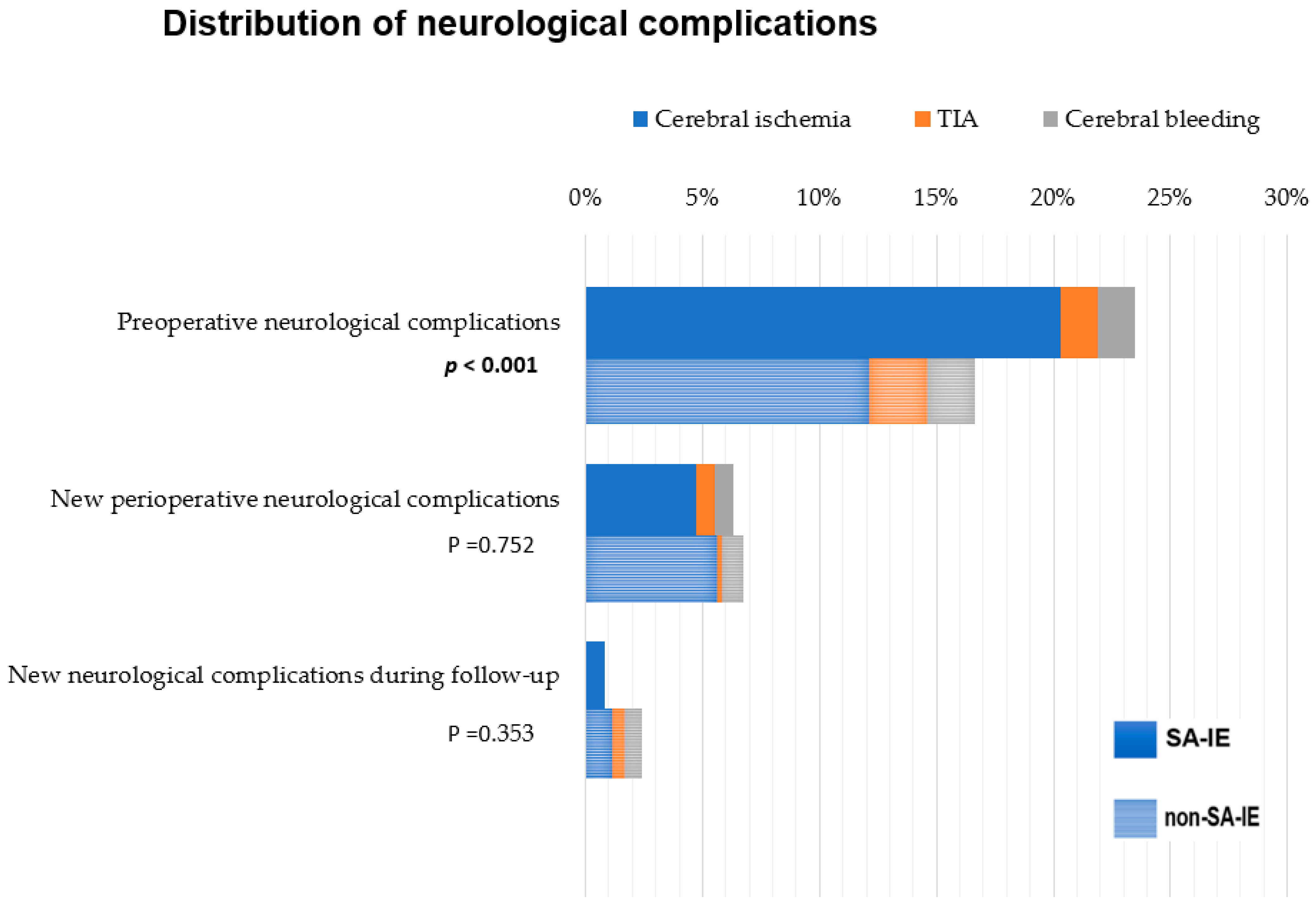 - Despite a higher frequency of preoperative neurological complications in the SA-IE group, the incidence of peri- and postoperative new onset neurological complications were comparable between both groups.
