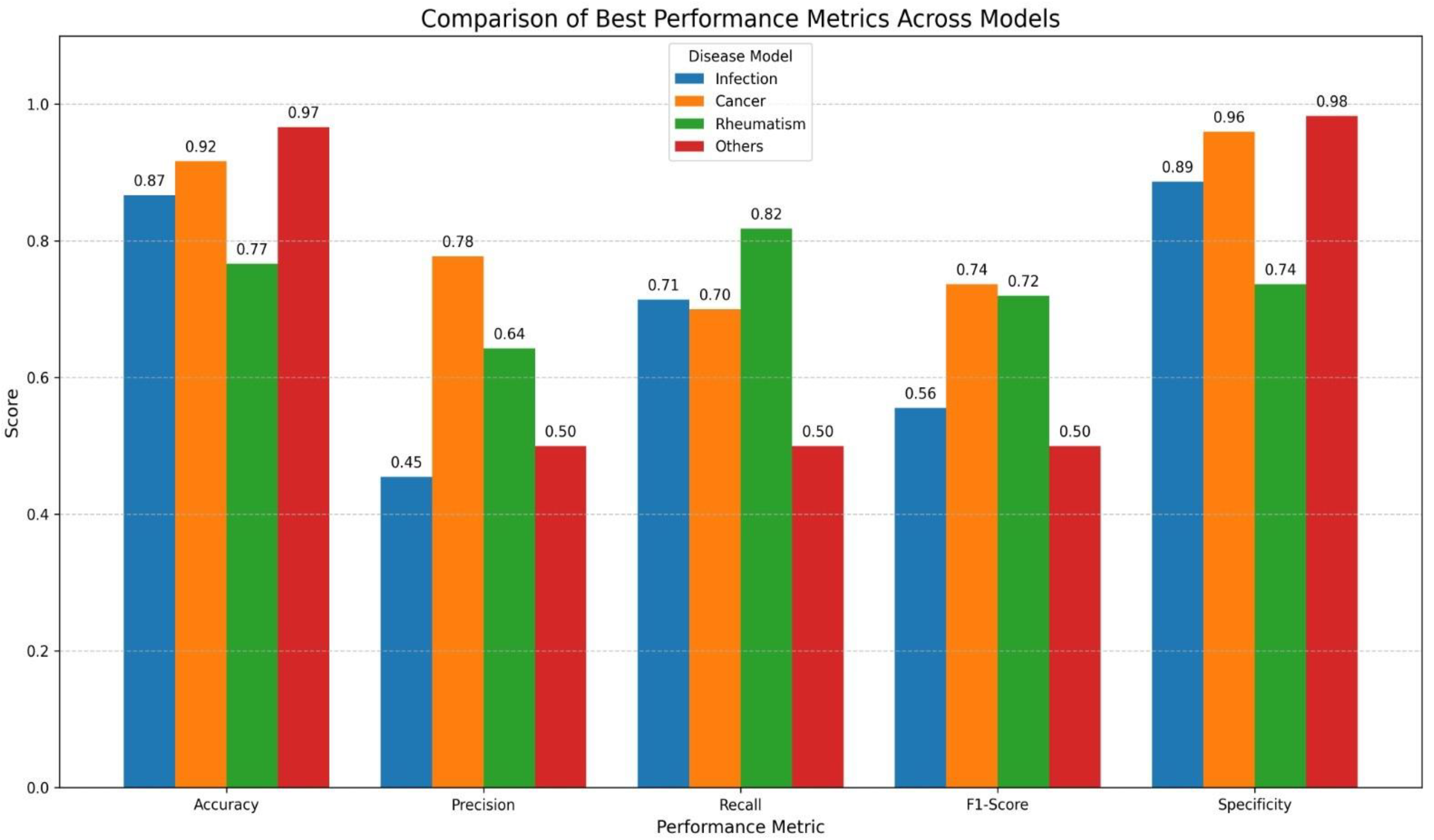 In our study, the lowest performance was observed in the model developed for predicting rheumatologic diseases. This model demonstrated high sensitivity and negative predictive value; however, its accuracy and specificity were relatively low. This suggests that the model was effective in identifying individuals with rheumatologic disease but showed limited success in excluding those without the condition. The model’s ability to detect rheumatologic disease was also found to be lower than that of the infection and malignancy models. This may be attributed to the clinical heterogeneity of autoinflammatory and autoimmune diseases, variability in laboratory findings, and the critical role of clinical history and physical examination findings in the diagnostic process. Despite substantial advances in diagnostic technology, accurate identification of rheumatologic conditions still relies primarily on meticulous clinical history and thorough physical examination, while algorithm-based approaches should be regarded as complementary rather than standalone diagnostic methods [