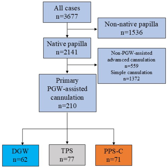 Altogether, 3677 ERCP cases in the registry at the time of analysis were included. Of the 2142 native papilla cases, 234 cases of PGW-assisted advanced cannulation were analyzed. The primary PGW-assisted technique selected was TPS in 77 cases, DGW in 62 cases, and PPS-C in 71 cases. No significant differences in the average age, body mass index, presence of juxtapapillary diverticula, or ASA scores were observed between the groups; however, the PPS-C group comprised significantly fewer female patients than the other groups (Supplementary Table S1).