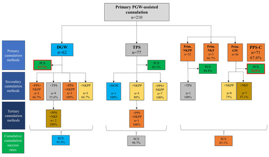 Primary cannulation attempts with a PGW-assisted advanced cannulation method (DGW, TPS, and PPS-C) means that these techniques were applied first after unsuccessful conventional guidewire cannulation attempts. Secondary and tertiary cannulation attempts (salvage advanced cannulation) were classified as follows: after failed attempts of cannulation with the primary PGW-assisted advanced cannulation method, a secondary—and after failure of that, in some cases, a third—advanced cannulation method was used.
