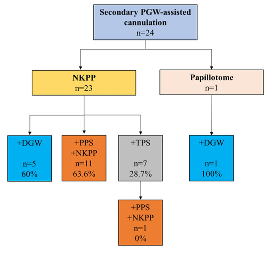 Flowchart of the secondary pancreatic guidewire-assisted cannulation methods and their success rates after non-PGW-assisted methods (DGW: double guidewire technique, TPS: transpancreatic sphincterotomy, PPS: prophylactic pancreatic stent, NKPP: conventional needle-knife precut papillotomy, light blue box: DGW, grey box: TPS, orange box: PPS-C, yellow box: NKPP, pink box: papillotome).