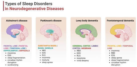 As life expectancy is constantly increasing, the number of people suffering from dementia and neurodegenerative diseases is rising steadily. Dementia is prevalent, as it is currently reported in up to 7% of individuals over 65 years old, and it is slightly higher in developed countries [1]. Additionally, there is an increasing incidence of young-onset dementia with a female predominance [2]. Neurodegenerative diseases pose challenges for healthcare systems, caregivers, and patients’ families. The main risk factors for developing dementia and related neurodegenerative conditions are advancing age, genetic profile, systemic vascular disease, and lifestyle [3]. Up to 40% of people with dementia have sleep disturbances and poorer disease prognosis as a result [4]. Among them, the most frequent is sleep-disordered breathing (SDB), followed by excessive daytime sleepiness (EDS), restless legs syndrome (RLS), rapid eye movement (REM) behavior disorder (RBD), and insomnia [5]. Neuropsychiatric symptoms are the main feature of all neurodegenerative disorders, with behavioral and psychological symptoms affecting nearly all dementia patients [6]. Apathy is the most frequent symptom, followed by depression, agitation, and aggression [7]. They arise in the moderate stages of disease and intensify as the disease progresses. Often, they appear before cognitive impairment [8,9]. Sleep disturbances increase the risk of mental health symptoms and the time of their onset [10]. An association of obstructive sleep apnea (OSA) with the risk for Alzheimer’s disease (AD) was shown, whereas insomnia was correlated with increased risk for both AD and vascular dementia (VaD) [11]. Both too long and too short sleep duration (≤4 or ≥10 h per night) contribute to an elevated risk of cognitive decline compared to moderate sleep length [12]. The inverted U-shaped association suggests that cognitive functions should be observed in middle-aged and older people susceptible to sleep issues [13]. Therefore, the goal of this review study is the following: (i) to describe clinical manifestations of sleep disturbances in different dementia-related neurodegenerative diseases; (ii) to review the molecular mechanisms underlying specific sleep disorders in these conditions; and (iii) to emphasize differences in sleep disturbances across neurodegenerative disease types that may support more accurate differential diagnoses and tailored therapeutic approaches.