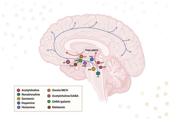 The transition between sleep and wake states is orchestrated by neuromodulatory centers located in the brainstem, basal forebrain, and hypothalamus. The latter contains the central circadian pacemaker, the SCN, which plays a critical role in adjusting the sleep–wake rhythm. The other key sleep-regulating regions sited in the hypothalamus involve the tuberomammillary nucleus (TMN) and the orexinergic and melanin-concentrating hormone (MCH) neurons in the lateral hypothalamus (LH) [86]. All above-mentioned brain areas consist of an interconnected network of nuclei, which, although limited to minor subcortical regions, modulate neuronal activity and cortical synchronization via vast projections throughout the brain; these extend to thalamic, hippocampal, and cortical areas [87]. The physiological sleep–wake rhythm is maintained by a complex interplay of mutual interconnections between various regions in the human brain. In general, different neural circuits control and orchestrate wake–sleep phases by the activity of wake-promoting, NREM-promoting, and REM-promoting cell populations. These populations interact via a “flip-flop switch” under the influence of SCN and determine the arousal state based on a mutual inhibition [88]. The excitatory wake-promoting neurons involved in an arousal state are spread across a number of nuclei throughout the brainstem, basal forebrain, and hypothalamus, referred to as the ascending reticular activating system (ARAS) [89]. More specifically, the activating system resides in the LH, locus coeruleus (LC), raphe nuclei (RN), and periaqueductal gray matter (PAG), which contain monoaminergic neuron populations [90]. By contrast, the sleep-promoting neurons in the hypothalamic intermediate nucleus (IntN) drive the sleep state primarily via inhibition of the wake-promoting neurons, depending on gamma-aminobutyric acid (GABA) neurotransmission [91]. In addition, the sleep–wake cycle regulation is fine-tuned by a complicated interplay of various external factors like neurotransmitters, hormones, and genetics, which will be discussed in more detail in the subsequent sections (Figure 2).