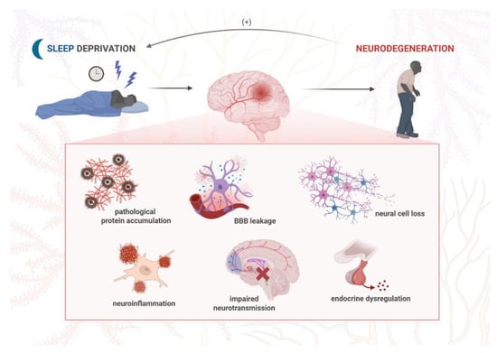 The molecular mechanisms underlying the effect of sleep deprivation on neurodegeneration development. Chronic sleep disturbances are associated with a number of neuropathological events, including neuroinflammatory response, increased accumulation of pathogenic proteins, loss of BBB integrity, neural cell death, disrupted neurotransmission, and hormone signaling. Such changes at the molecular level not only drive neurodegeneration and dementia symptoms but also aggravate sleep disturbances, which potentiate the sequence of pathological events in the nervous system in a positive feedback loop. Created in BioRender. Siwecka, N. (2025) https://BioRender.com/q495vp2.