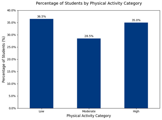 A total of 277 medical students were analysed. The mean age was 23.61 years (standard deviation (SD) = 8.23). Regarding ponderal status, 11.19% were underweight, 66.79% normal weight, 17.33% overweight, and 4.69% obese. According to the IPAQ classification, 36.50% of participants were categorized as having low physical activity, 28.50% moderate, and 35.00% high (Figure 1). Two-thirds of the sample reported poor sleep quality (PSQI > 5, 67.15%). Descriptive statistics for the main continuous variables are presented in Table 1.