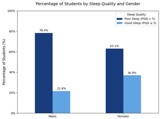 Mean PSQI was 7.20 ± 3.43 (median 7 [5–9]); 67.15% (186/277) met the threshold for poor sleep (PSQI > 5). By sex, poor sleep prevalence was 78.38% in males vs. 63.05% in females (Figure 2) (χ2 p = 0.0239), whereas mean PSQI did not differ statistically (7.57 ± 2.83 vs. 7.06 ± 3.62, p = 0.114).
