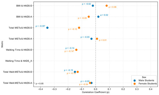 Sex-stratified Spearman correlations (ρ) between physical activity, BMI, and mental-health outcomes (HADS-D and HADS-A). Blue = male students; orange = female students. Star-shaped symbols (★) denote statistically significant correlations (p < 0.05). Negative ρ values indicate inverse relationships (higher activity or walking time associated with lower depressive symptom scores).
