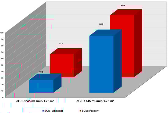 While the relationship between poor kidney function and adverse cardiovascular outcomes is well established and generally progresses linearly with CKD stage, our findings showed no significant association between lower levels of eGFR and increased prevalence of SCMI. It is important to note that the prior literature has predominantly focused on overt CVD outcomes [,,,,], while subclinical disease processes such as SCMI is mainly underexplored. Differences in the associations of CKD with overt CVD versus SCMI probably reflect differences in pathophysiological pathways and disease timelines. While reduced eGFR contributes to cardiac remodeling through mechanisms such as volume overload, arterial stiffness, mineral dysregulation, and systemic inflammation, SCMI likely results from focal ischemic injury or microvascular compromise, processes that may not directly correlate with kidney disease biomarkers []. Additionally, individuals with low eGFR are often targeted for intensive cardiovascular monitoring and early preventive therapy, which may attenuate or delay the development of detectable SCMI, potentially masking any direct relationship [].