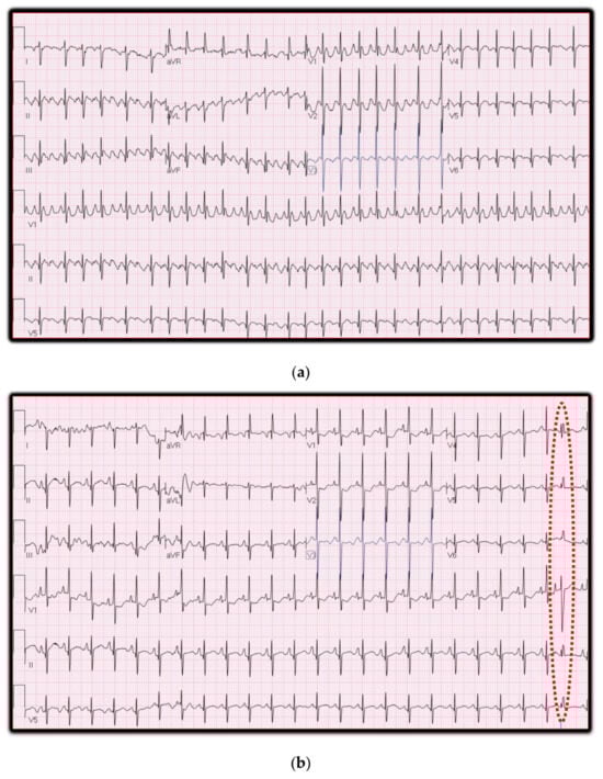 Electrocardiogram showing atrial flutter (top panel) and premature atrial contractions during sinus rhythm (bottom). (a): Atrial Flutter at 440 beats per minute (BPM) and mostly 2:1 atrio ventricular (AV) Conduction (b): ECG performed in Sinus Rhythm for the same patient showing premature atrial contraction (PAC) with aberrant conduction (highlighted with red dotted oval).