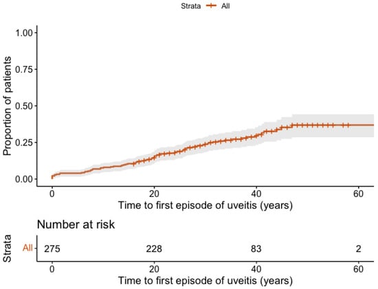Within the study population, 100 out of 299 patients (33.4%) had experienced at least one episode of AAU by the end of the follow-up period, with a mean number of episodes of 4.0 (SD 4.6), and an incidence rate of 1.15 per 100 person-years. The Kaplan–Meier curve suggests a linear increase in the cumulative incidence of AAU over time, associated with disease duration (Figure 1). After 20 years of disease duration, the probability of having experienced a first episode of uveitis was 14.6% (95% CI 10.3–18.7), while after 40 years, this probability increased to 29.6% (95%CI 23.3–35.4).