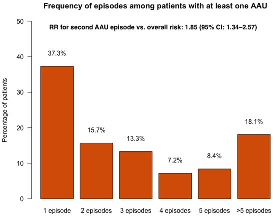 Among patients who experienced at least one episode of AAU, 37.3% had only one episode, while 62.7% experienced more than one episode (Figure 2). This corresponds to a relative risk (RR) of 1.85 (95% CI: 1.34–2.57) for developing a second episode after the first, compared to the overall risk of any episode in the total population.