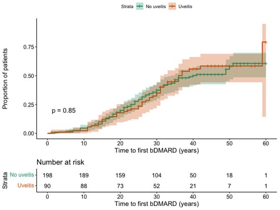 We then assessed whether a history of AAU was associated with a higher likelihood of subsequent bDMARD initiation (excluding those who started bDMARDs before the onset of AAU). Kaplan–Meier curves (Figure 3) showed that the cumulative probability of bDMARD initiation over time was similar between patients with and without AAU (p = 0.850). At 20 years following axSpA symptom onset, the probability of initiating bDMARDs was 17.8% (95% CI: 9.4 to 25.3) in patients with a history of AAU, compared to 19.7% (95% CI: 14.0 to 25.1) in those without AAU. After 40 years of disease duration, these probabilities increased to 55.8% (95% CI: 42.2 to 66.2) and 50.0% (95% CI: 41.6 to 57.3), respectively.