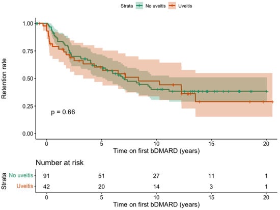 Finally, bDMARD retention rates were not influenced by a history of AAU. After both two and five years of treatment, retention was similar between groups. This suggests that the presence of AAU does not negatively impact long-term adherence or the effectiveness of biologic therapy in routine clinical care. In fact, if a drug is effective in controlling uveitis, rheumatologists may be less inclined to switch therapies, given the limited number of agents with proven efficacy against this manifestation. Thus, treatment decisions may be more conservative in patients with AAU. To our knowledge, no prior observational studies have evaluated bDMARD retention in relation to the presence of uveitis, and future research is warranted to confirm these findings.