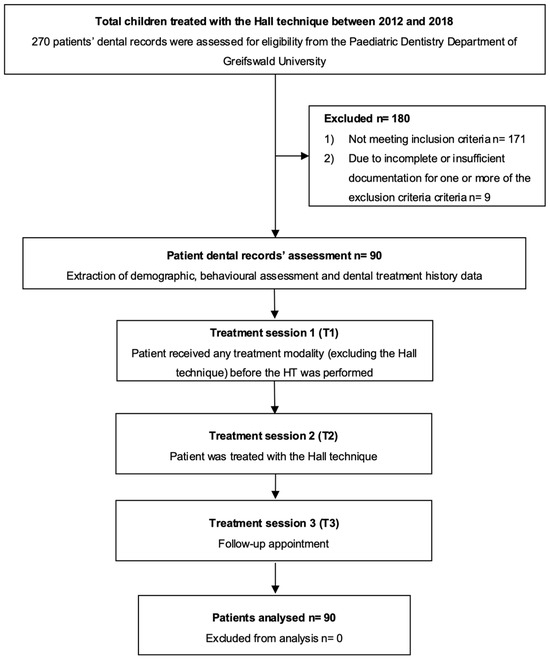 Inclusion criteria for this study were children aged 3–10 years with at least one primary molar treated with the HT, with three treatment sessions (T1, T2, and T3), T2 being the appointment when the HT was placed, and a treatment span of 6 months. Exclusion criteria included preformed metal crowns (PMC) placed using the standard technique (injection, caries removal, and tooth preparation) or any modified HT (e.g., removal of proximal contacts, removal of occlusal surfaces, selective caries removal), treatment performed under sedation or under general anaesthesia, and cases without adequate documentation of the patient’s level of cooperation as assessed by the FBRS. Records found to contain inadequate documentation were excluded. The study diagram is shown in Figure 1.